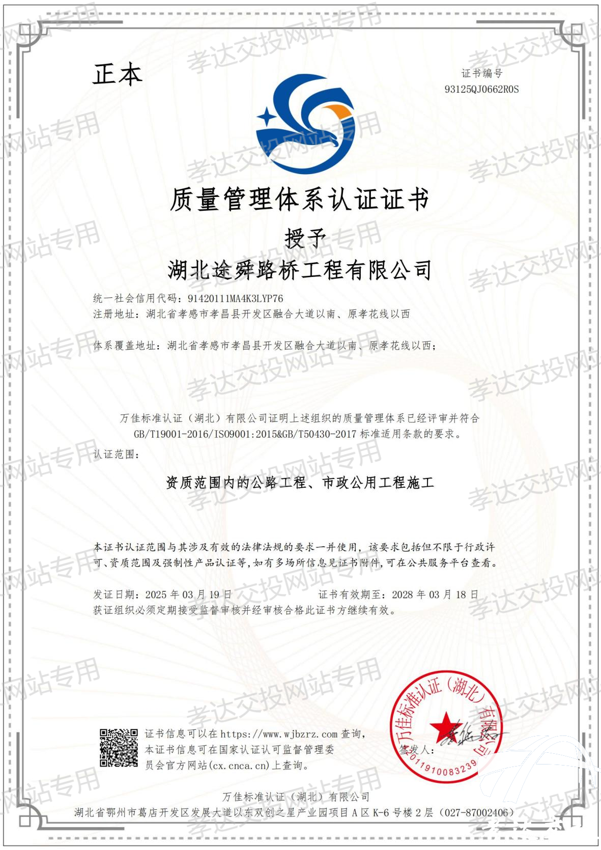 太阳集团tcy8722子公司湖北途舜路桥工程有限公司通过三标管理体系认证