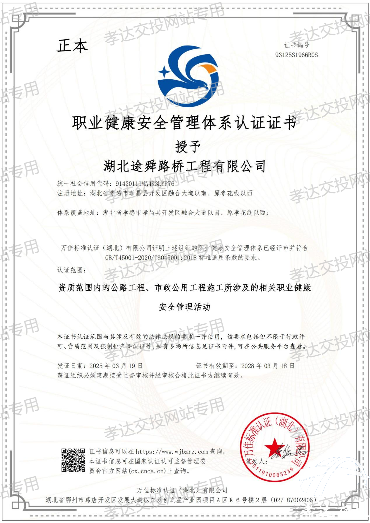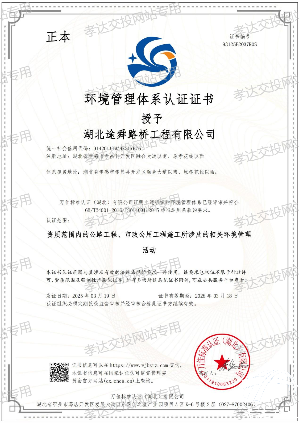 发布时间: 2025-03-21 17:47:263月19日,太阳集团tcy8722全资子公司——湖北途舜路桥工程有限公司,在顺利通过中国质量认证中心万佳标准认证中心《质量、环境和职业健康安全管理》三标体系认证审核后,取得三标管理体系认证证书。